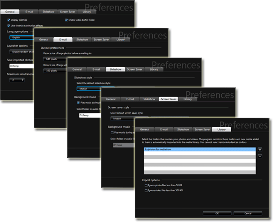 Да уж... Впрочем, сдержанно обойдёмся без комментариев и приступим к рассмотрению настроек программы, которые поделены на пять вкладок. Каждая из них содержит изменяемые параметры, определяющие работу MediaShow: включение/отключение эффектов анимации интерфейса (нужно заметить — весьма красивой анимации), выбор языка интерфейса (русский, к великому сожалению, отсутствует), расположение папок с файлами и прочие характеристики.