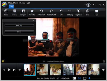 Сразу же хотелось бы описать одно из бросающихся в глаза умений этой программы: распознавание лиц в фотографиях (в режиме видео поиск лиц не работает — соответствующая кнопка попросту отсутствует). Этот поиск можно произвести вручную, выбрав любую фотографию и нажав кнопку Tag Faces. Радует, что лица определяются даже в некачественных, затемнённых и с прочими изъянами фотографиях.