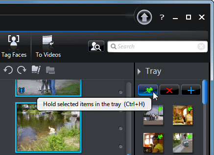 Вернувшись из режима редактирования, нужные фотографии следует переместить в Tray — так называется копилка проекта, куда помещаются готовые к окончательной обработке фото- видеоматериалы, и "закрепить" их там нажатием кнопки с изображением... кнопки (ну куда же без тавтологии).