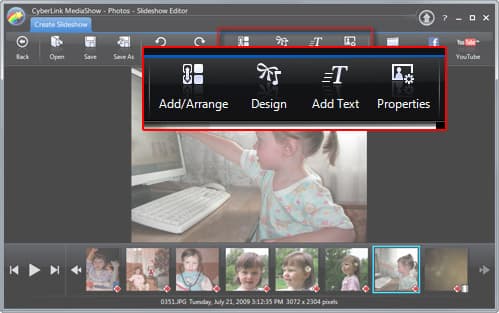 Пора переходить к следующему этапу — редактированию параметров слайдшоу. Нажатие кнопки Create Slideshow открывает Slideshow Editor. В данном окне пользователю предлагается тем или иным образом отредактировать создаваемое слайдшоу: кнопки, запускающие нужные модули, расположены в главной панели инструментов.