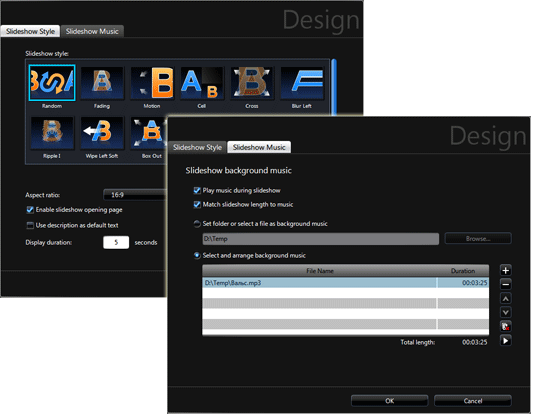 Кнопка Design такими настройками слайдшоу, как последовательность переходов между фото- видеоматериалами, аспектом (соотношением) сторон кадра в создаваемом видео. Здесь же можно определиться с фоновым музыкальным сопровождением, а заодно подогнать длительность слайдшоу под выбранную композицию.