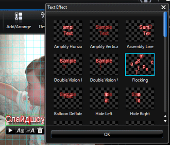 Следующей кнопкой — Add Text — вызывается инструмент, с помощью которого в слайдшоу можно вставить различные надписи. При этом позволяется изменить оформление шрифта и анимировать его появление.