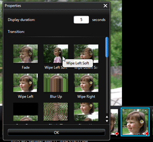 Ну и, наконец, последняя кнопка Properties: в данном окне можно выбрать нужный переход для выделенной заранее фотографии, а также назначить индивидуальную длительность отображения слайда.