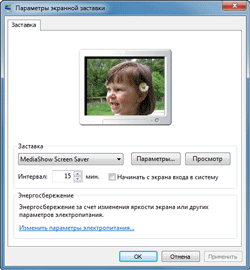 Нажатие одноимённой кнопки открывает стандартное окно настроек экранной заставки Windows, где циклически отображаются все фотографии, ранее добавленные в альбом.