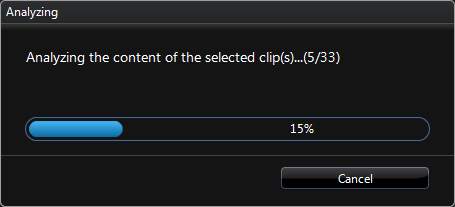 Если стиль выбран, сразу же начинается довольно длительный процесс анализа видео, находящегося в проекте. Так, 33 видеоклипа AVCHD 1920x1080 общей длительностью в полчаса программа анализировала около пяти минут (к слову, видео стандартного разрешения, сжатое в DV или MPEG-2, анализируется в четыре-пять раз быстрее).