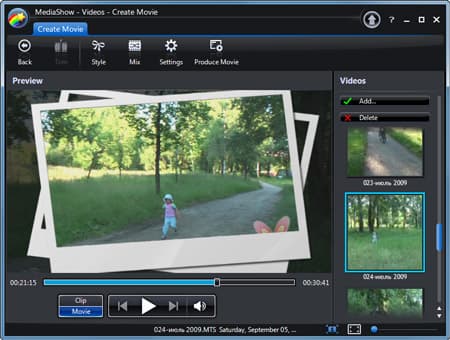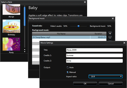Но продолжим знакомство с модулем Create Movie. Находящиеся в панели инструментов кнопки говорят сами за себя: кнопкой Style вызывается уже знакомое нам окно со списком стилей, где можно подобрать более подходящий вашему видео стиль. Следующая кнопка Mix открывает окно, где пользователь может добавить своё музыкальное сопровождение к фильму (если оно имеет длительность меньше, чем фильм, то станет циклично проигрываться), а также настроить громкость музыки относительно звука в видеофайлах. Последняя кнопка настроек — Settings — открывает окно с текстовыми полями, которые рекомендуется заполнить. Ведь это не что иное, как вступительные и заключительные титры.
