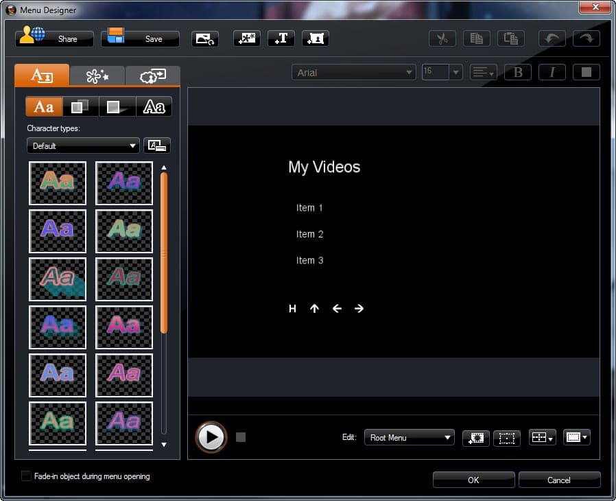 Программа поддерживает создание многоуровневых меню. Если при создании меню выбран какой-то шаблон, то многоуровневые меню создадутся автоматически, т.е. главы фильма, которые "не влезли" в первую страницу, перейдут на следующую, также автоматически сгенерированную. Если вас не устраивают шаблоны меню, имеющиеся в составе дистрибутива или скачанные из DirectorZone (да-да, и менюшками пользователи активно обмениваются), то можно и самому заняться изготовлением оного. Для этого здесь имеется модуль Menu Designer, в котором предусмотрены все необходимые инструменты.