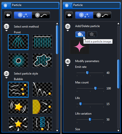 Следующее нововведение в программе: Particle Effects Designer. Ну просто мечта любителя поукрашать своё видео рамочками и летающими расфигулечками. Разберём этот модуль подробнее.
