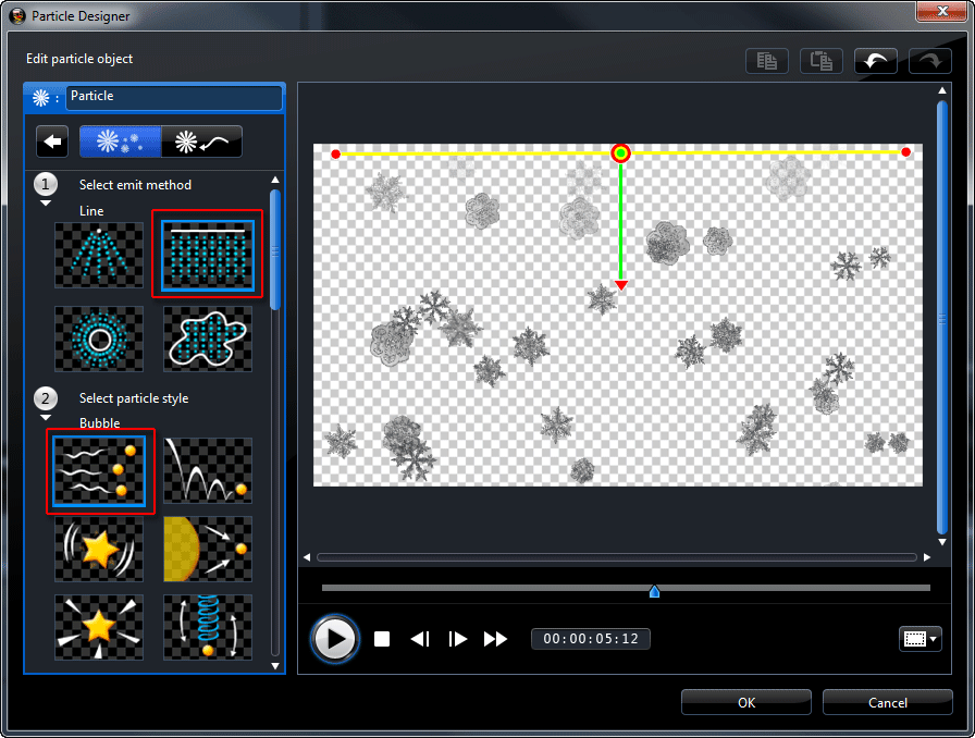 Ну а теперь самое время сделать пару щелчков мышью в параметрах Select emit method и Select particle style. Наверное, не нужно объяснять значение этих пиктограмм — схематичное изображение движения частиц говорит само за себя. Выбрав способ перемещения частиц и их поведение в движении, нужно задать траектории или направление движения этих частиц. Для этого воспользуемся желто-зелёной конструкцией в экране монитора, ключевые точки которой можно зацепить мышкой и перетащить в любую часть экрана. Кстати, в любой момент вы можете нажать кнопку Play и тут же, в окошке, просмотреть поведение частиц.
