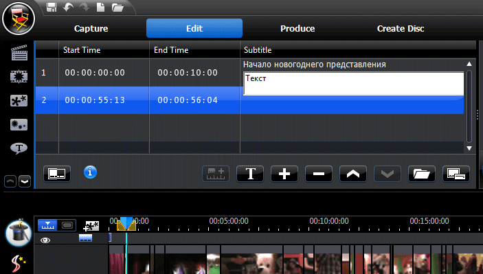 Теперь посмотрим, удобно ли в программе создавать субтитры. Делаются они в модуле, называющемся Subtitle Room, который вызывается кнопкой на панели инструментов либо клавишей F12. Здесь, во-первых, нужно определиться с типом титров, которые вам нужны: отключаемые или же впечатанные в видеокадр.