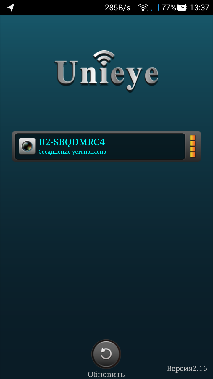 | Подключение к точке доступа, которая создана камерой, первоначально производится без ввода пароля | Запуск приложения Unieye. Доступная камера отображена в списке вместе с текущим уровнем мощности сигнала |