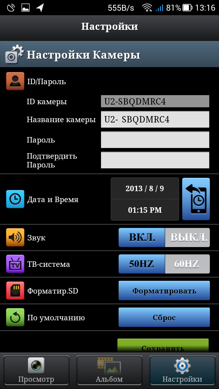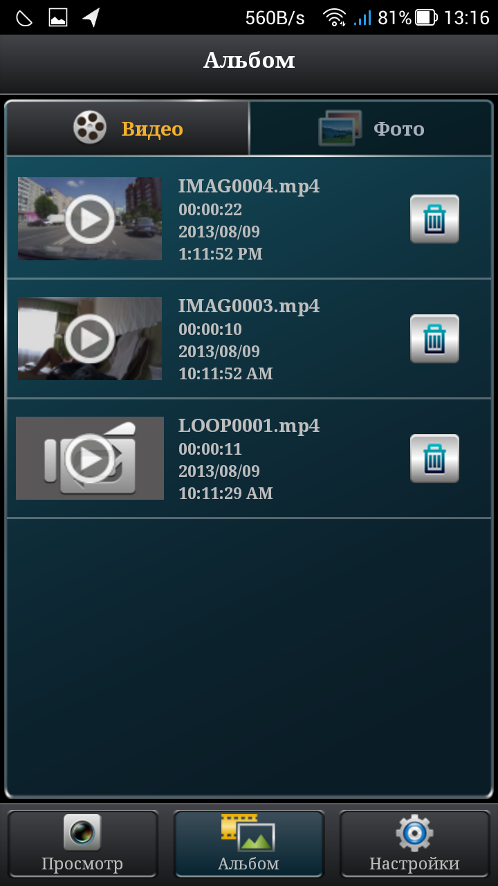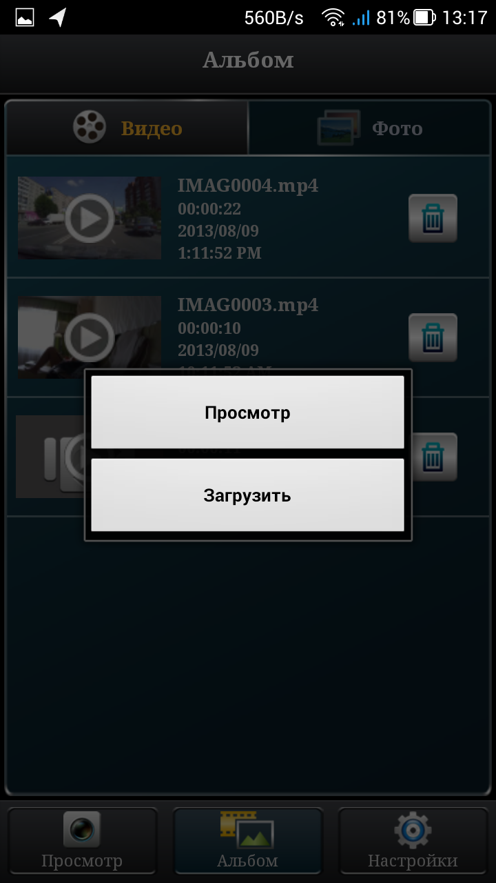 Просмотр записанного материала, как фото, так и видео, можно осуществить непосредственно мобильным устройством, не выходя из управляющей программы, во вкладке Альбом. Имеющиеся фотографии и видеоролики отображаются миниатюрами; любой материал можно не только просмотреть, но и загрузить сразу в память телефона или планшета.