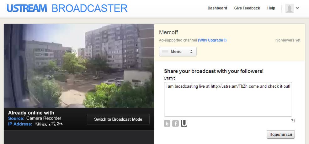 Единственный минус тут — отсутствие детектора движения. Камера просто транслирует все, что «видит», без разбора и анализа. Ну а плюс — это возможность подключиться к Ustream из любой точки мира, в том числе и с мобильного телефона, и увидеть происходящее в поле зрения камеры.