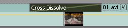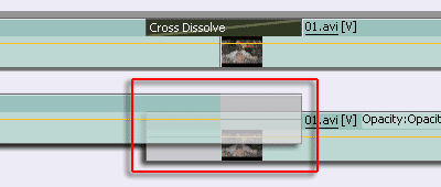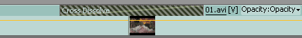 Здесь видим, что переход, имеющий название Cross Dissolve (перекрестное растворение), расположен точно по центру стыка двух разных видеоклипов: 00.avi и 01.avi. Так в чем же тут закавыка? А в том, что правильная работа любого перехода возможна лишь в том случае, когда склеиваемые этим переходом клипы имеют те самые «запасные» кадры: