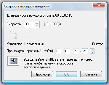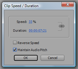 В этом великолепном видеоредакторе скорость клипа изменяется довольно просто: лишь нажмите правой кнопкой мыши на клипе, и выберите из контекстного меню пункт Speed/Duration... В появившемся одноименном окне введите нужное значение (в данном случае 33%), и нажмите ОК.