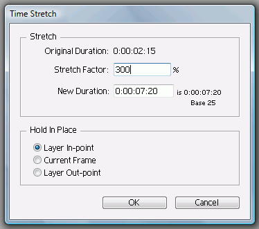 Что нам покажет легендарный монстр композитинга? Модуль изменения длительности клипа здесь вызывается также из контекстного меню: Time -> Time Stretch. Здесь, в отличие от Premiere, чтобы замедлить видео в три раза, необходимо ввести не 33, а 300% — сказывается несколько иная логика разработчиков, все-таки After Effects не монтажная программа...