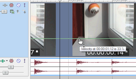 В этом довольно оригинальном видеоредакторе даже длительность клипа изменяется необычно (с точки зрения Premiere-водов, разумеется). Достаточно включить на клипе отображение линии скорости (Insert -> Video Envelopes -> Event Velocity), и теперь, зацепив мышкой эту зеленую линию, тяните ее куда угодно, вверх или вниз. Плавающая рядом с курсором подсказка отображает текущую позицию курсора, а также процент ускорения либо замедления. И здесь, как раньше, мы замедлим видео в три раза: утянем зеленую прямую вниз до 33%.