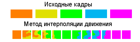 Метод интерполяции оценивает движение между кадрами и дорисовывает кадры в нужной фазе движения (на рисунке — схематичная иллюстрация фаз движения).