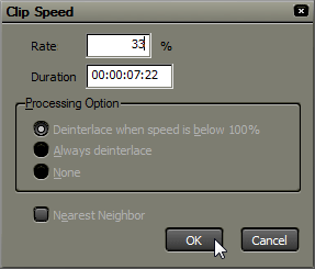 Здесь скорость клипа изменяется подобно тому, как это делается в Premiere — с помощью модуля, вызываемого либо через контекстное меню, либо (что гораздо быстрее и удобнее) нажатием «горячих клавиш». Alt+E, и окошко Clip Speed перед вами, остается лишь ввести знакомые 33%.