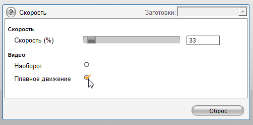 Данный плагин в среде специалистов позиционируется как наиболее «продвинутое» средство для изменения скорости проигрывания видео. На рисунке приведены настройки, с которыми производилось изменение скорости нашего клипа. Для начала испробуем способ Blend.