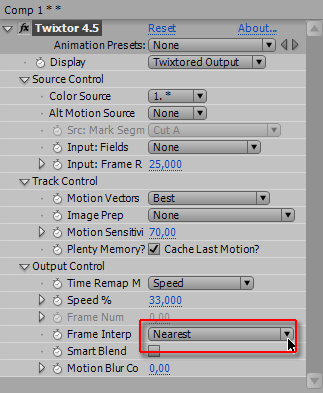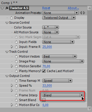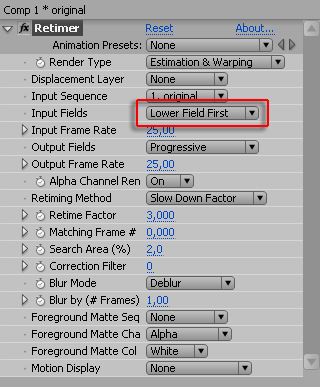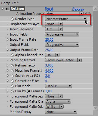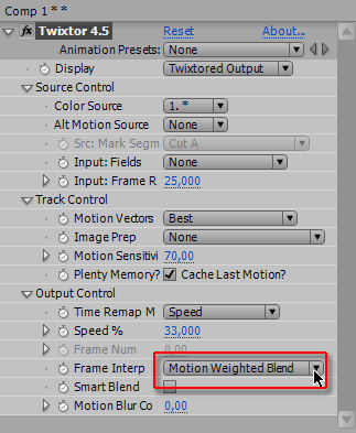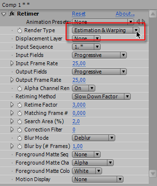 Понадеемся на мудрость разработчиков, и оставим настройки данного плагина по умолчанию. Все настройки, кроме способа просчета. Данный плагин предлагает на выбор три способа, и первый из них — Estimation&Warping (Сравнение и Изменение). Предполагается, что плагин при просчете станет анализировать видео, и искусственно дорисовывать недостающие кадры.