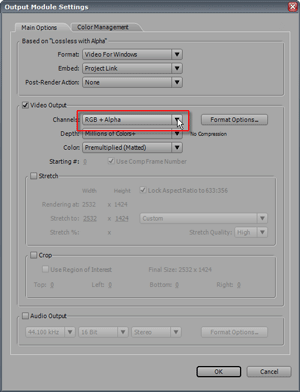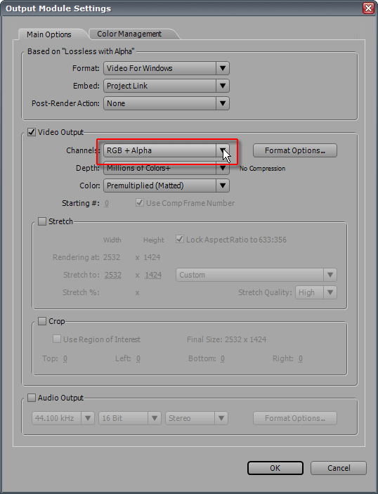 Но можно пойти и другим путем: щелкнуть по синей надписи шаблона, и в строке Channels открывшегося окна Output Module Settings выбрать параметр RGB+Alpha.