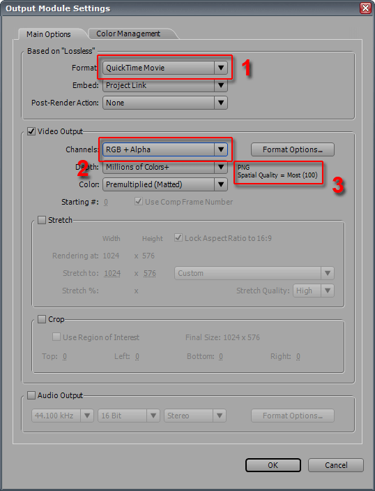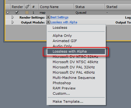 Просчет проекта в видеофайл производится командой Composition -> Make Movie... (Ctrl+M). На таймлинии появится новая вкладка — Render Queue, где в первую очередь следует обратить внимание на параметр Output Module — скорее всего, здесь в выпадающем меню вы найдете устраивающий вас шаблон. Он называется Lossless with Alpha и обозначает видео без потерь (несжатое), содержащее альфа-канал.