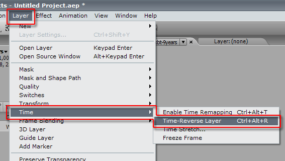 За такой эффект в AE отвечает команда Layer -> Time -> Time Reverse Layer. Вызвать эту команду можно также сочетанием клавиш Ctrl+Alt+R.