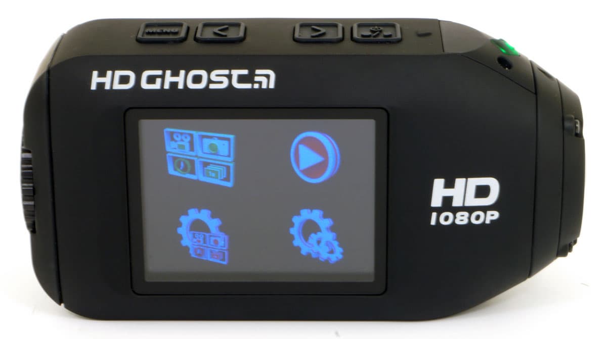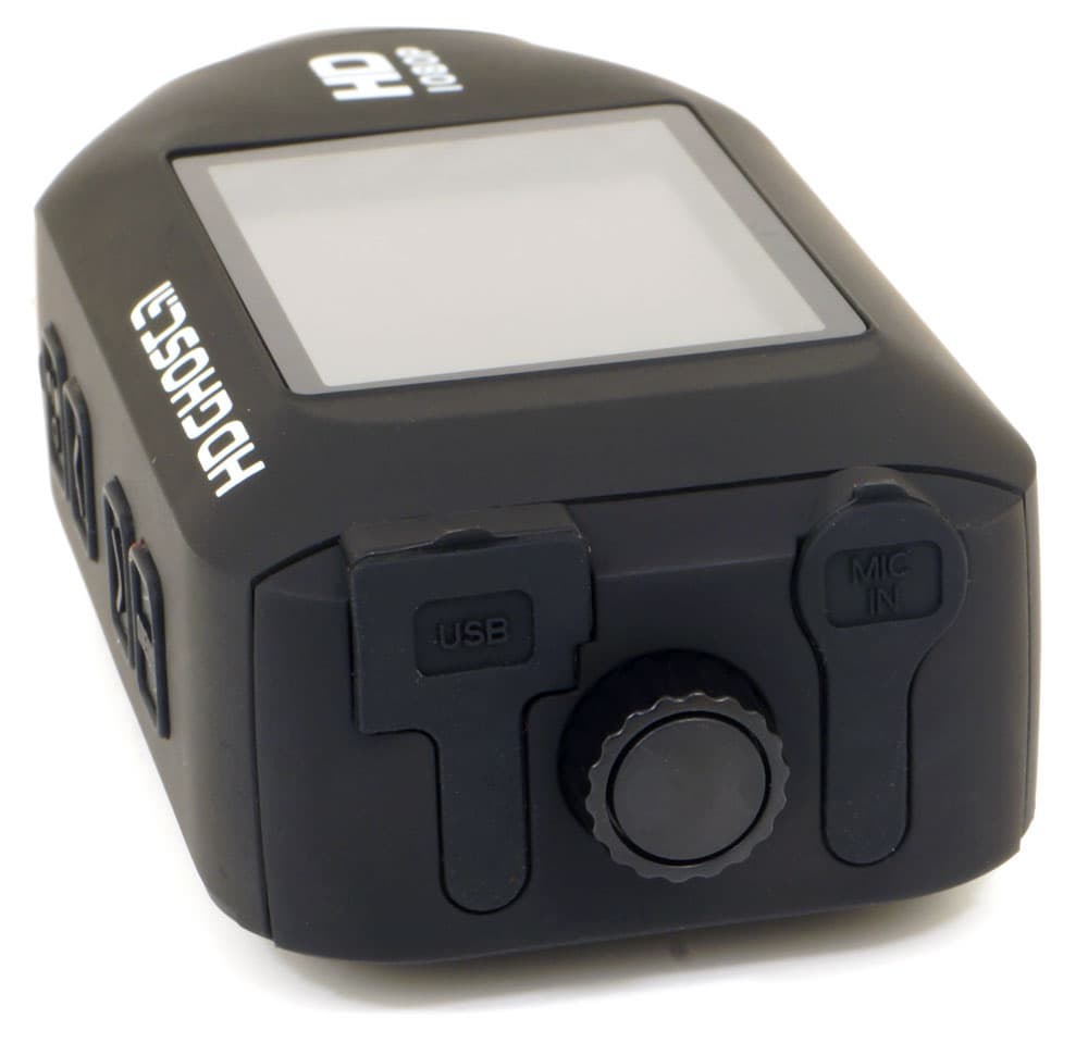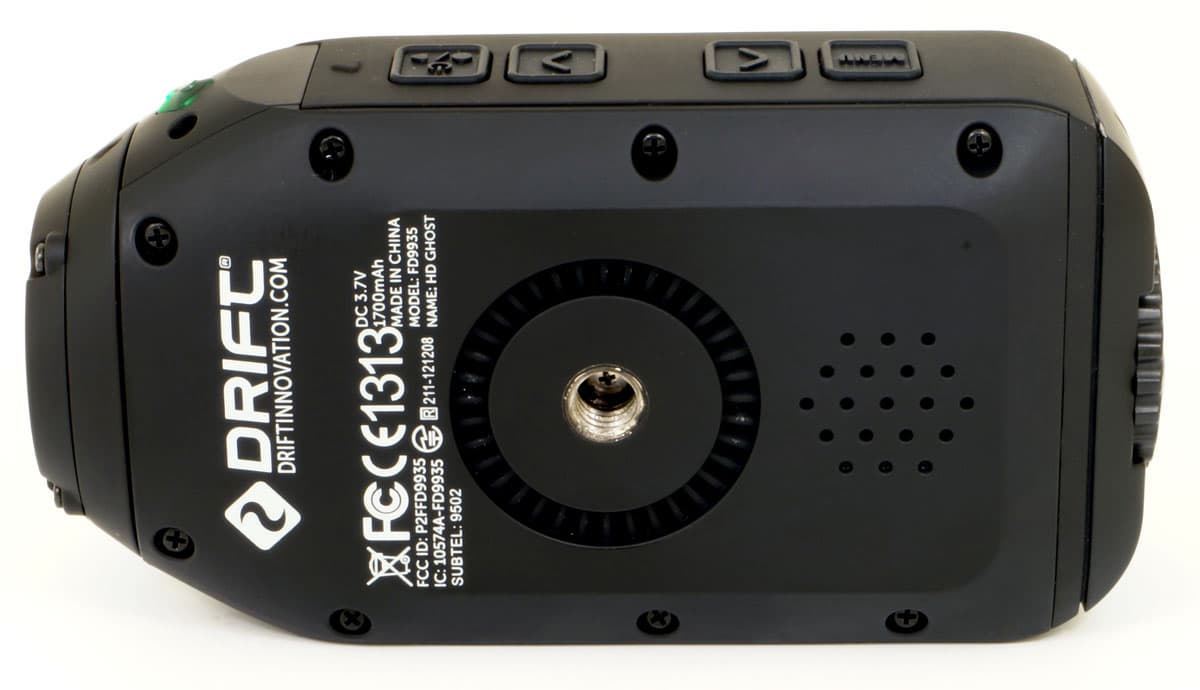 Одно из ребер корпуса имеет четыре кнопки, которые прячутся под резиновыми накладками с пиктограммами. С помощью данных кнопок производится все управление камерой, как контроль записи, так и регулирование настроек в служебном меню. В некоторых случаях кнопки могут выполнять разные функции, все зависит от длительности нажатия на них.