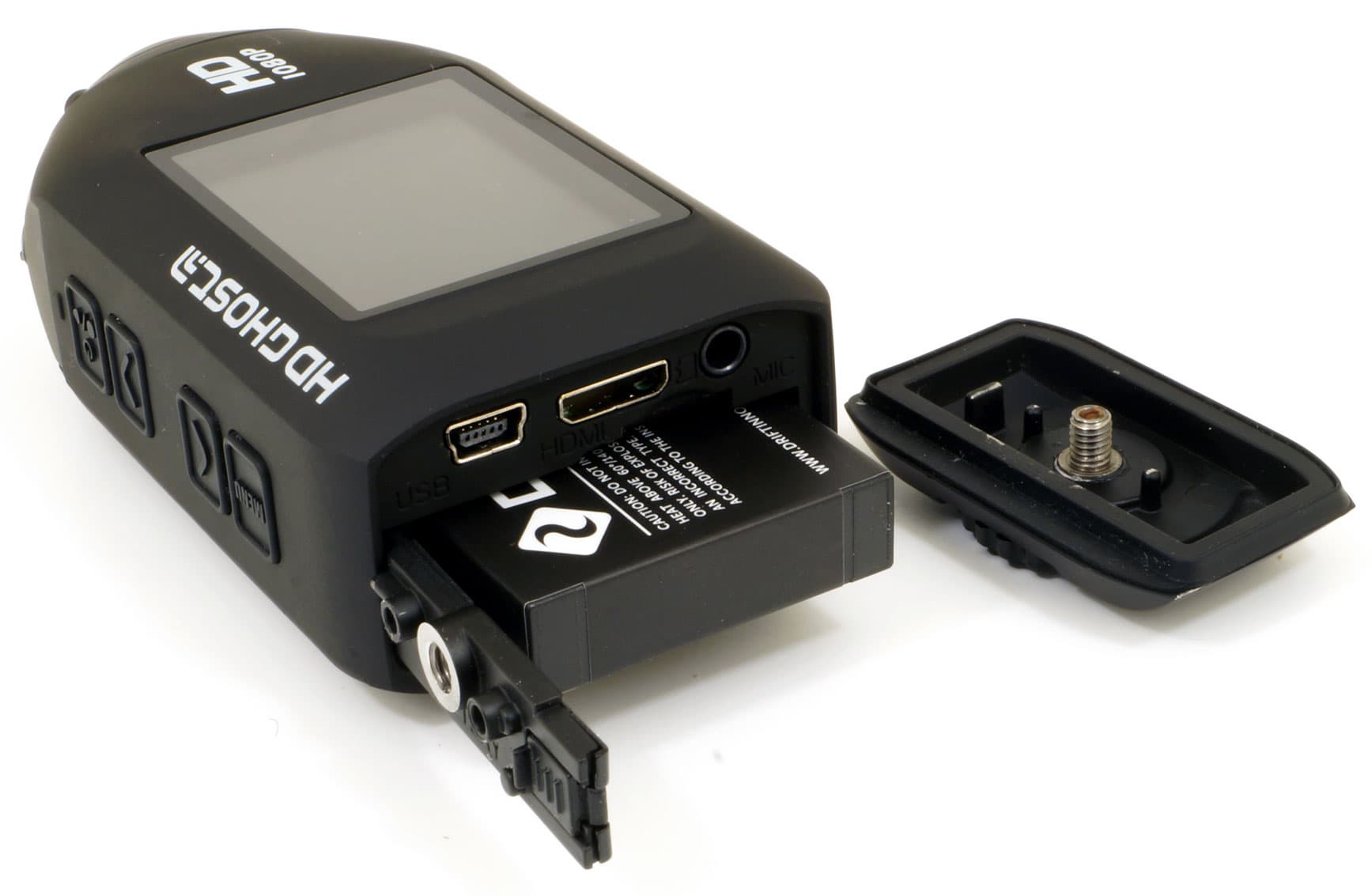 Но самое интересное находится в тыльной части корпуса, противоположной объективу. Здесь мы видим довольно спорное решение: полностью съемная крышка. Да, она закупоривает корпус, делая его герметичным. И привинчивается надежно, случайным движением ее никак не сдернешь. Тогда почему же решение названо спорным? Да все просто: такая крышка может легко потеряться. Особенно, если замена аккумулятора или карты памяти производится в походных условиях. На заметку любому владельцу, в том числе и потенциальному: внимание и еще раз внимание! Сняв крышку, спрячьте ее в карман или в перчатку.
