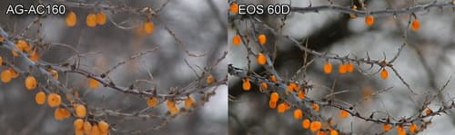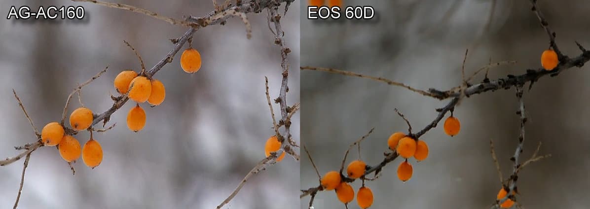 Но видеоDSLR имеет явное преимущество во время съёмок со светосильной оптикой. Видеокамера в таких условиях уже требует накамерный фонарь. В противном случае придётся использовать усиление, что не самым лучшим образом сказывается на качестве видео.
