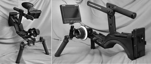 Одной из интересных конструкций, позволяющих облегчить видеосъёмку на DSLR, является «риг». Это не только возможность съёмки в классическом стиле «с плеча», но и коммутация, соединение разных устройств на одном «обвесе»: там могут быть установлены, в числе прочих, follow-focus, компендиум, внешнее питание, монитор и микрофоны. В принципе, это может оказаться удобным, но устройство имеет довольно приличный вес. Мой риг с полным «обвесом» и камерой весит почти 6 кг! В то время как видеокамера с аккумулятором и площадкой под штатив (монопод) весит 2,7 кг. К тому же следует помнить о немалой стомости рига — мой обошёлся мне почти в $600.