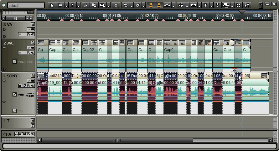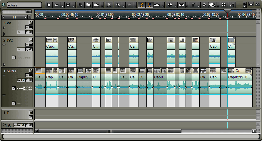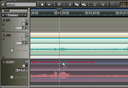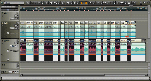 Как видно на рисунке, источник звука был ближе к камере SONY, и все же JVC уловила достаточно для того, чтобы мы синхронизировали клипы. Теперь, после того, как видео с обеих камер расположено в точном соответствии с окружающим звуком, сделаем так, чтобы нам были видны клипы с обеих камер одновременно. Ведь в чем заключается монтаж материала, взятого с двух (и более) камер? В вырезании ненужных фрагментов с первой камеры (оператор споткнулся, дрогнула рука) и оставлении нужных (второй оператор поймал редкий кадр, в то время как его коллега уткнул объектив в носок собственного ботинка). Следовательно, мы должны видеть в реальном времени