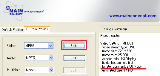 Если вы не желаете, чтобы видео переконвертировалось целиком (пусть даже в таком щадящем режиме), выберите в окне MainConcept Mpeg Elements Export Settings настройки, соответствующие тем, с которыми вы захватывали видео (например, CBR, 6Мбит/с). Для изменения шаблона переключитесь на закладку Custom Profiles и нажмите в пункте Video кнопку Edit.