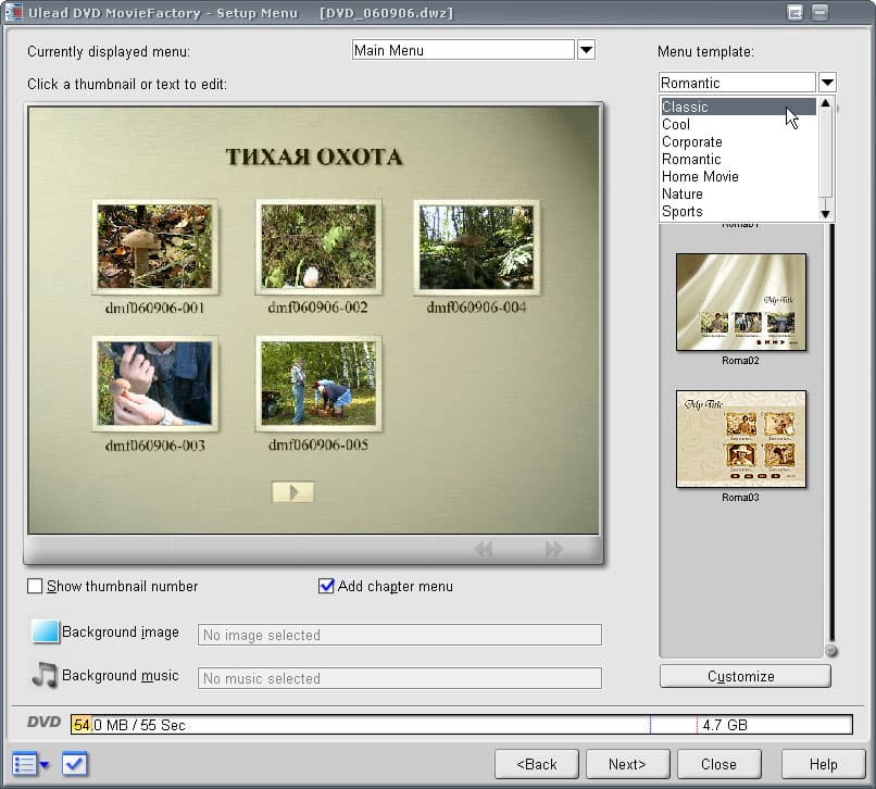Создание меню не заставит вас вникать в тонкости DVD-авторинга, все, что дозволено пользователю — это изменение текста в надписях (кириллица поддерживается), да выбор готовых шаблонов. Список их невелик, однако тематика оформления охватывает практически все жизненные ситуации, от романтического настроения до спортивных заставок.