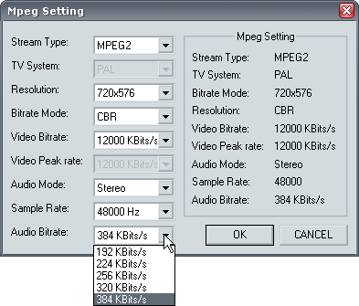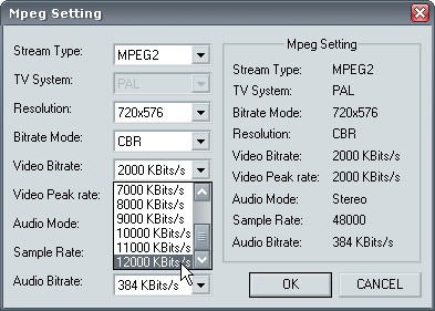 Богатые настройки MPEG позволят создать видео самого разного качества с битрейтом от 2000 до 12000 Кбит/с. Кроме постоянного битрейта (CBR) доступно использование и переменного (VBR), при этом верхняя и нижняя границы потока также задаются вручную.