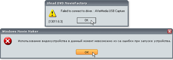 Дальнейшие действия проводились на трех разных компьютерах, как со свежеустановленными Windows XP SP2, так и изрядно нагруженными различным программным обеспечением. Везде и всегда результат был один: ни одна из установленных программ, имеющих модуль захвата аналогового видео, не согласилась работать с устройством, зато варианты сообщений об ошибках поразили своим разнообразием.