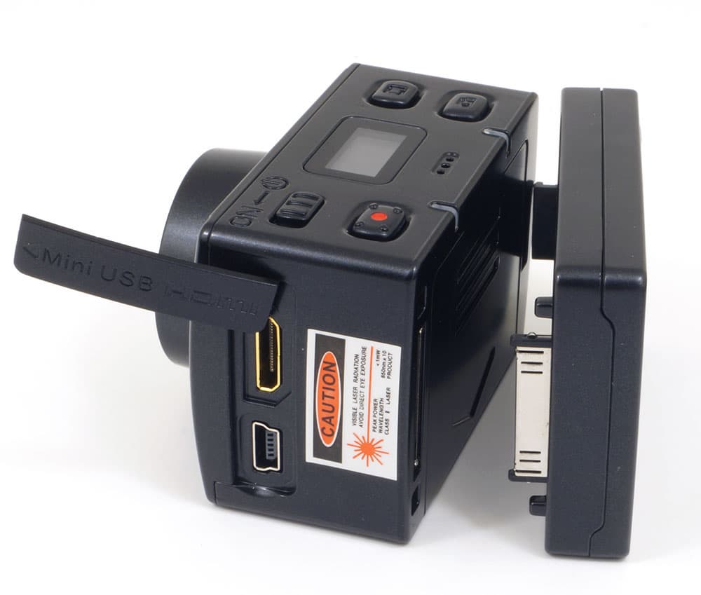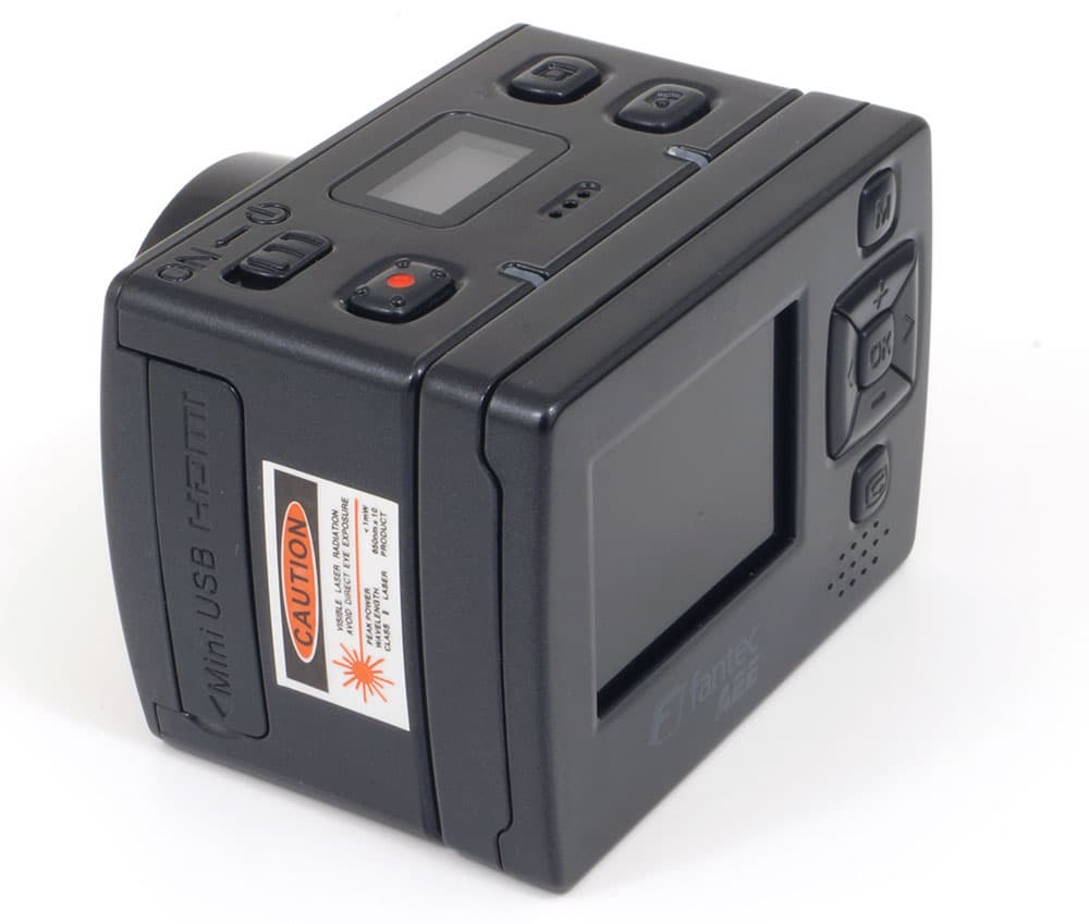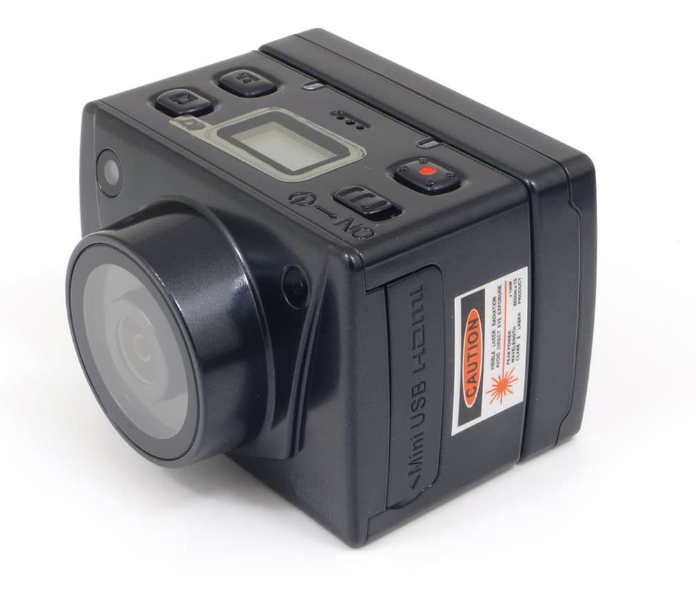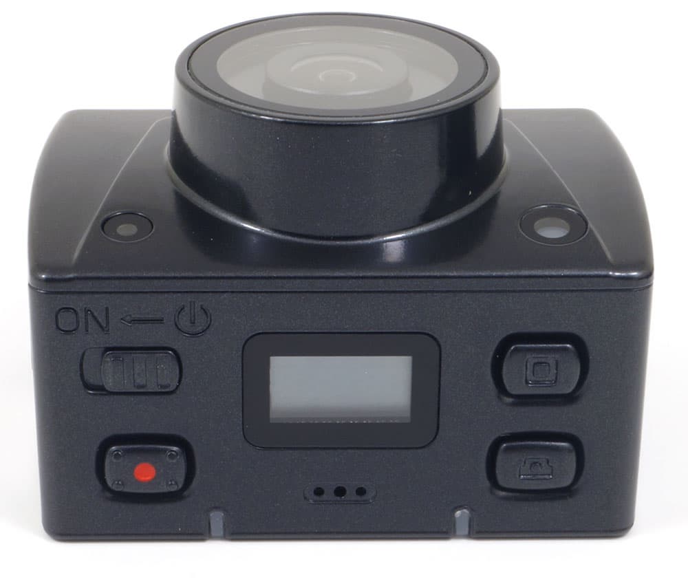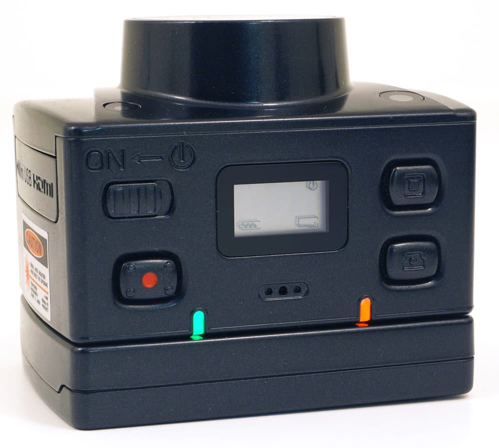 Выступающий на один сантиметр объектив камеры прикрыт защитным стеклом, устойчивым к повреждениям. Над объективом расположены индикатор режима работы и встроенный лазерный указатель направления съемки.