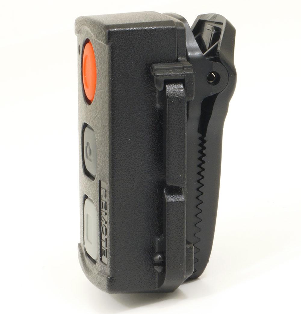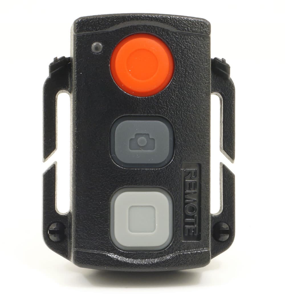 Прилагаемый радиопульт дистанционного управления имеет три крупные резиновые кнопки: старт, стоп и фото. О нажатии кнопки сигнализирует небольшой красный светодиод. Максимальное расстояние, на котором держится связь между пультом и камерой, составляет примерно 20 метров при отсутствии преград. Корпус пульта ДУ оснащен двумя ушками, позволяющими прикрепить его к ремню, а также съемной клипсой-зажимом. Пульт работает от одной батарейки-таблетки CR2032; чтобы сменить батарею, потребуется разобрать пульт, открутив четыре винта, находящиеся на обратной стороне корпуса.