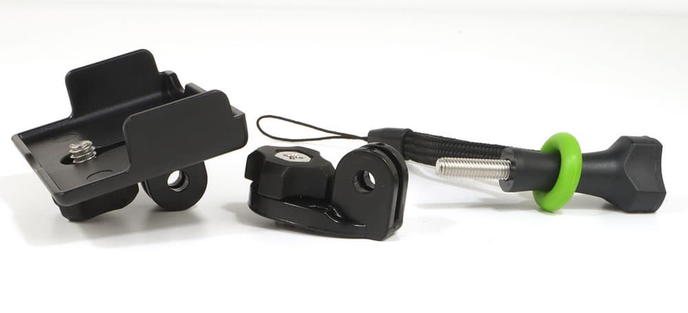 Также в комплекте имеется опорная площадка для привинчивания к ней камеры без бокса (удобно при использовании в качестве видеорегистратора)и дополнительное крепление с ушками. Запасные части к кронштейным креплениям позволят произвести быструю замену утерявшихся деталей. Перечисленное добро умещается в небольшую матерчатую сумку с замком-липучкой, которую можно повесить на пояс.