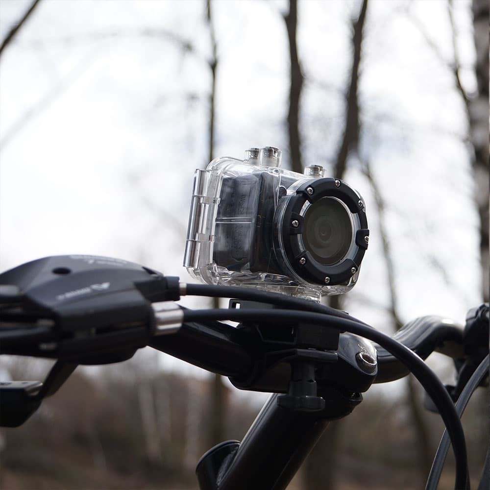 Камера на голове оператора цепко держится с помощью прилагаемого головного ремня, а для крепления камеры к рулю был использован оставшийся от прежних камер держатель со штативной резьбой (опять она, резьба! Кто желает выступить против стандартов?). Во время съемки на велосипедной прогулке выяснилась странная особенность: камера, закрепленная на руле, записала значительно меньше тряски, чем камера, закрепленная на голове (для сведения — у оператора со здоровьем в порядке).