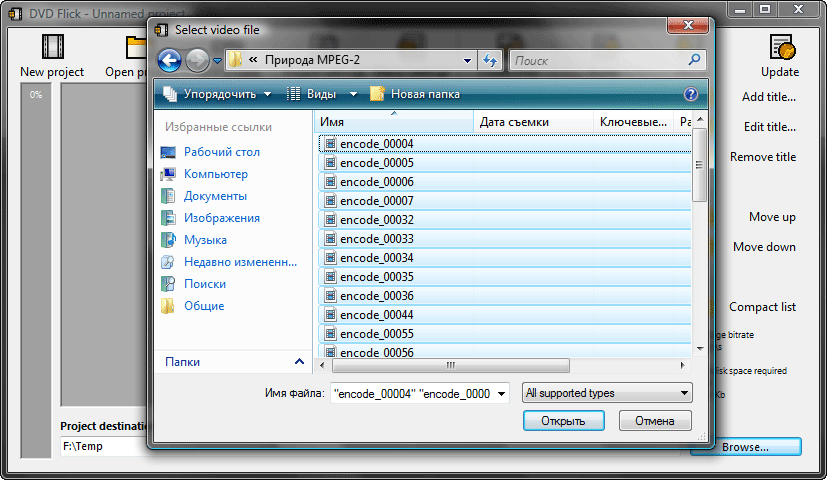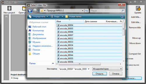 Так и есть! Нажатие кнопки Add title приводит к появлению диалогового окна открытия файла или файлов. В нашем случае — именно файлов, поскольку для будущего диска мы подготовили множество MPEG-2 видеофайлов. Для того, чтобы импортировать в проект все до единого подготовленного файла, нажмем Ctrl+A, и вслед за этим — кнопку Открыть.