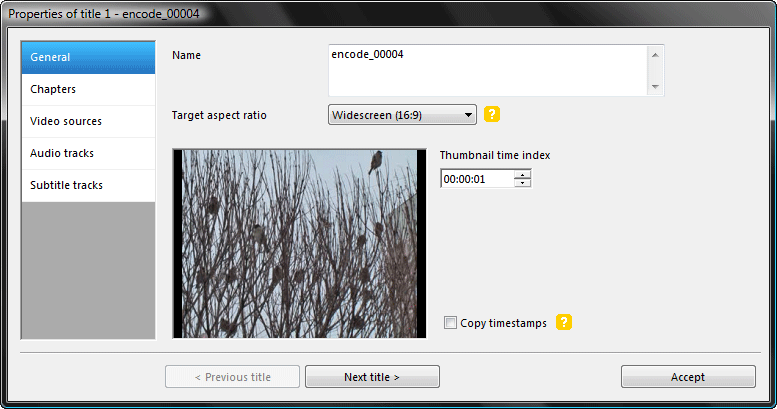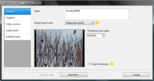 Для этого выделим один из файлов и нажмём кнопку Edit title. Ага, теперь архитектура программы понятна. Появившееся окно содержит пять вкладок, в каждой из которых производятся настройки того или иного параметра. Первая вкладка с названием General определяет общие параметры создаваемого диска. Здесь от вас потребуется выставить правильное соотношение сторон кадра (странно, что программа не смогла определить его самостоятельно). Чуть ниже мы видим поле с названием Thumbnail time index. Что означает данный параметр? Всё просто — какую секунду или минуту мы здесь выставим, тот кадр и станет отображаться в меню диска в качестве миниатюры.