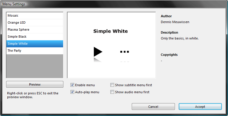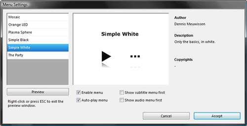 Выбрав один из этих шаблонов, снимем флажки с пунктов Show subtitle menu... и Show audio menu... (в нашем диске нет дополнительных аудиодорожек или субтитров, так что и выбирать нечего). Не забудем выставить флажок на пункте Enable menu, иначе меню работать не будет.