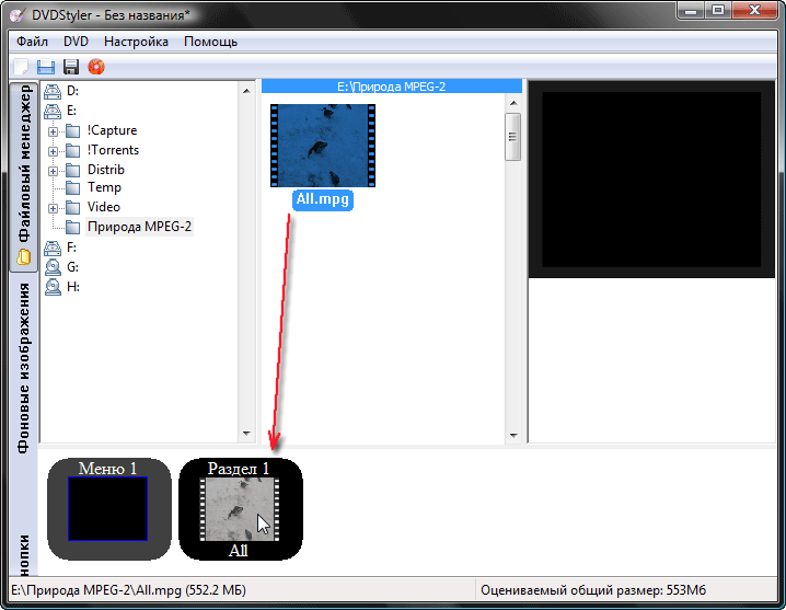 Итак, попробуем создать самый примитивный диск, состоящий из одного меню с выбором сцен. Желательно, чтобы исходный материал представлял собой один непрерывный видеофайл, поскольку большое их количество потребует значительно большей работы. Найдём этот файл в проводнике, и перетянем его вниз, на своеобразную таймлинию.