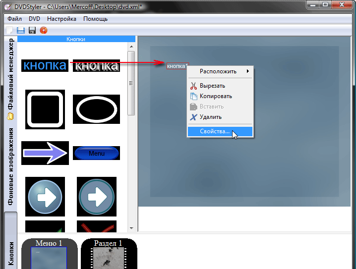 И ещё одна новость, которую нельзя назвать хорошей. Похоже, здесь нам не удастся сгенерировать диск в полуавтоматическом режиме, как мы это с успехом проделали в предыдущей программе, более лояльной к обыкновенному пользователю. Практически каждая операция в DVDStyler производится вручную, каждая создаваемая кнопка или меню требуют последующей работы в окне их свойств и т.п.