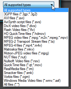 Вслед за выбором видеофайлов неизбежно следует вопрос: а какие, собственно, форматы поддерживает данная программа? Ответ найти легко — он кроется здесь же, в выпадающем меню "понимаемых" программой типов файлов. Ого! Неплохой набор, местами обгоняющий любую профессиональную программу, даже поддержка MKV имеется!