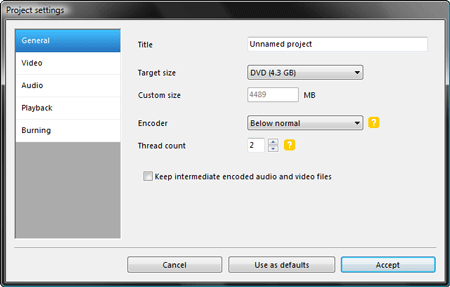 После того, как видео или иной материал импортирован в программу, обратите внимание на объект, находящийся в левой части программного окна. Это — индикатор свободного места на будущем DVD-диске, он поможет пользователю вовремя остановиться, если тот бездумно наполняет и наполняет диск материалом. Диск... Как же мы забыли о носителе? А ну-ка, проверим, что программа понимает под текущим носителем. Ну а где может содержаться такая информация, как не в настройках проекта? Для того, чтобы открыть окно настроек проекта, нажмем соответствующую кнопку (Project settings).