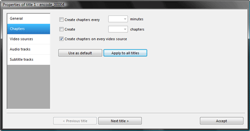 Следующая вкладка — Chapters — определяет количество сцен, на которые будет "разбито" ваше видео. Если в проект входит множество видеофайлов небольшой продолжительности — не следует здесь ничего менять, пусть поля остаются пустыми. Если же исходным материалом для вашего видео служит один или несколько довольно продолжительных видеофайлов, то имеет смысл либо дать команду на автоматическое расставление Chapters через выбранный вами временной интервал (Create chapters every # minutes), либо создать точно заданное их количество (Create # chapters). К сожалению, вручную расставить сцены в нужных именно вам местах тут нельзя — нет такой возможности.