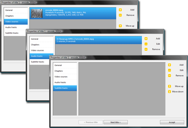 Следующие три вкладки довольно банальны — в них выводится информация о потоках, обнаруженных программой в импортированном материале: видео, аудио, субтитры. Здесь же можно добавить дополнительные аудиодорожки или субтитры.